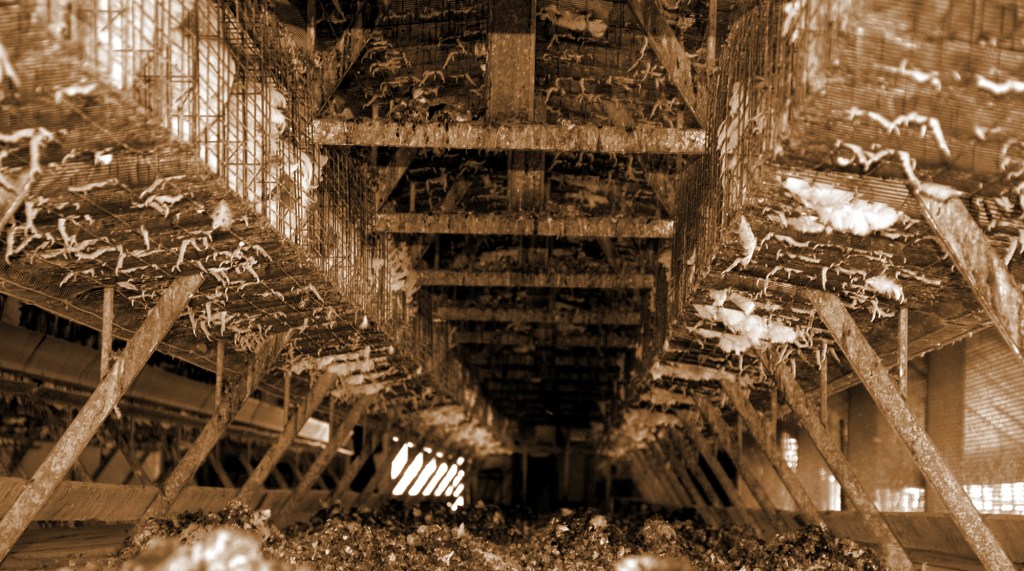 L’élevage consiste aussi à placer ces individus dans des lieux clos – souvent de petites cages en métal qui leur scieront les doigts – pour les contenir et améliorer la rentabilité qu’on va tirer d’eux. Rien qu’en France, plus de 80 % de tous les individus exploités dans les élevages vivent l’intégralité de leur existence dans des bâtiments fermés ou sur des caillebottis sans accès à l’extérieur [7]. Cela représente 850 millions d’individus par an, rien qu’en France, sur le milliard d’individus tués chaque année.