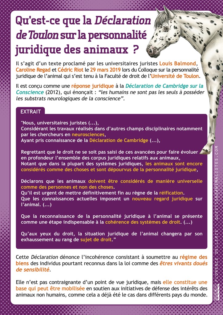 Il s’agit d’un texte proclamé par les universitaires juristes Louis Balmond, Caroline Regad et Cédric Riot le 29 mars 2019 lors du colloque sur la personnalité juridique de l’animal qui s’est tenu à la Faculté de droit de l’Université de Toulon.