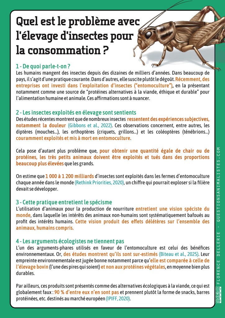 Des études récentes montrent que de nombreux insectes ressentent des expériences subjectives, notamment la douleur (Gibbons et al., 2022). Ces observations concernent, entre autres, les diptères (mouches…), les orthoptères (criquets, grillons…) et les coléoptères (ténébrions…) couramment exploités et mis à mort en entomoculture.