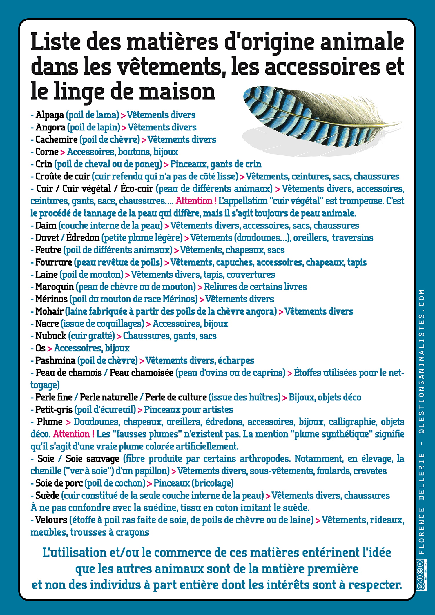 Liste des matières d’origine animale dans les vêtements, les accessoires et le linge de maison