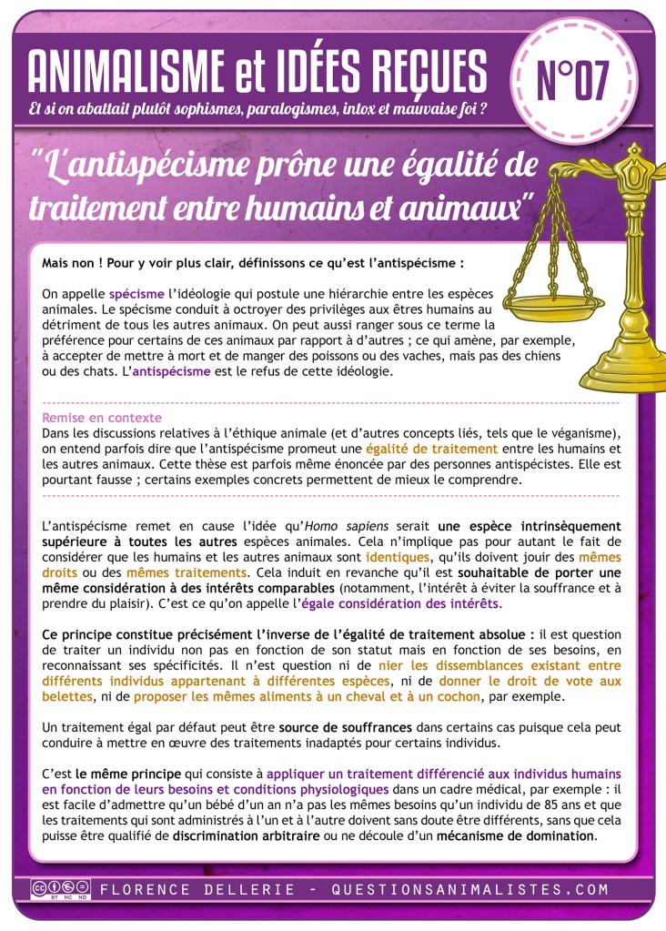 Dans les discussions relatives à l’éthique animale (et d’autres concepts liés, tels que le véganisme), on entend parfois dire que l’antispécisme promeut une égalité de traitement entre les humains et les autres animaux. Cette thèse est parfois même énoncée par des personnes antispécistes. Elle est pourtant fausse ; certains exemples concrets permettent de mieux le comprendre.