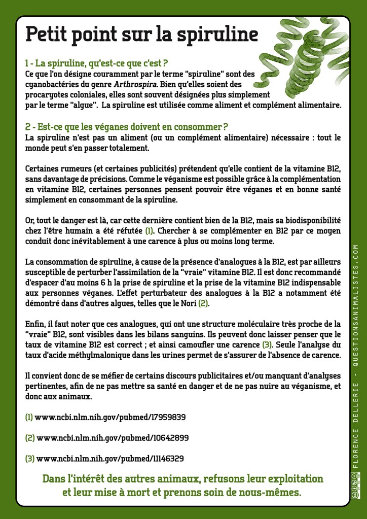 ► »Les cyanobactéries comestibles ne constituent pas une source de vitamine B(12) acceptable, en particulier chez les végétaliens » : Vitamin B12 sources and bioavailability (Vitamine B12, sources et biodisponibilité) : « The edible cyanobacteria are not suitable for use as vitamin B(12) sources, especially in vegans » :