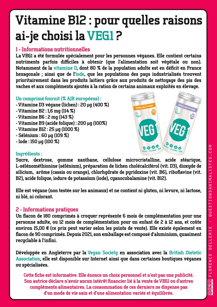 Cette fiche est informative. Elle énonce un choix personnel et n’est pas une publicité. Son autrice déclare n’avoir aucun intérêt financier lié à la vente de VEG1 ou d’autres compléments alimentaires. La consommation de ces derniers ne dispense pas d’un mode de vie sain et d’une alimentation variée et équilibrée.