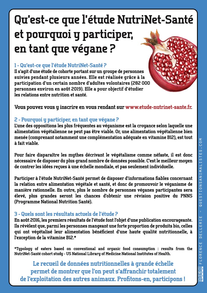 Participer à l’étude NutriNet-Santé permet de disposer d’informations fiables concernant la relation entre alimentation végétale et santé, et donc de promouvoir le véganisme de manière rationnelle. En outre, plus le nombre de personnes véganes participantes sera élevé, plus grandes seront les chances d’obtenir une révision positive du PNNS (Programme National Nutrition Santé).