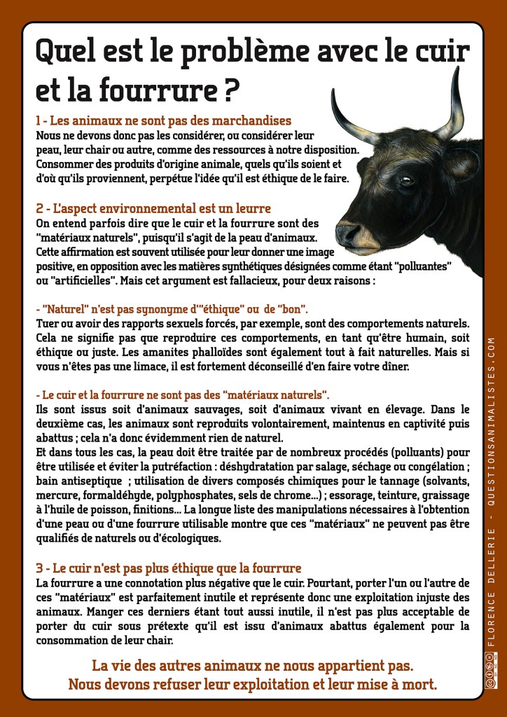 La fourrure a une connotation plus négative que le cuir. Pourtant, porter l’un ou l’autre de ces “matériaux” est parfaitement inutile et représente donc une exploitation injuste des animaux. Manger ces derniers étant tout aussi inutile, il n’est pas plus acceptable de porter du cuir sous prétexte qu’il est issu d’animaux abattus également pour la consommation de leur chair.